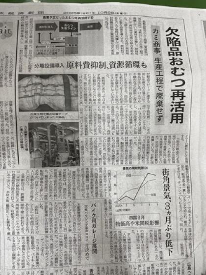 | カミ商事(株)様は紙おむつロス排出ゼロを目指して、環境問題の取り組みの一環として資源の有効活用を図るべき、紙おむつの生産工程中から排出されるロスを分離して、再利用する取り組みを行います。 紙おむつ生産会社では初めての取り組みであり、CO2の排出も年間852トン削減。 日本経済新聞様にも掲載されました。 当協会会員のカミ商事(株)様、プラント設置を支えたサハシ特殊鋼(株)に感謝いたします。 協会見学にご協力を頂き、ありがとうございました。 写真は左からカミ商事(株)井川社長様、サハシ特殊鋼(株)角田リーダー様、須東亮一会長・浅井理事。 |
